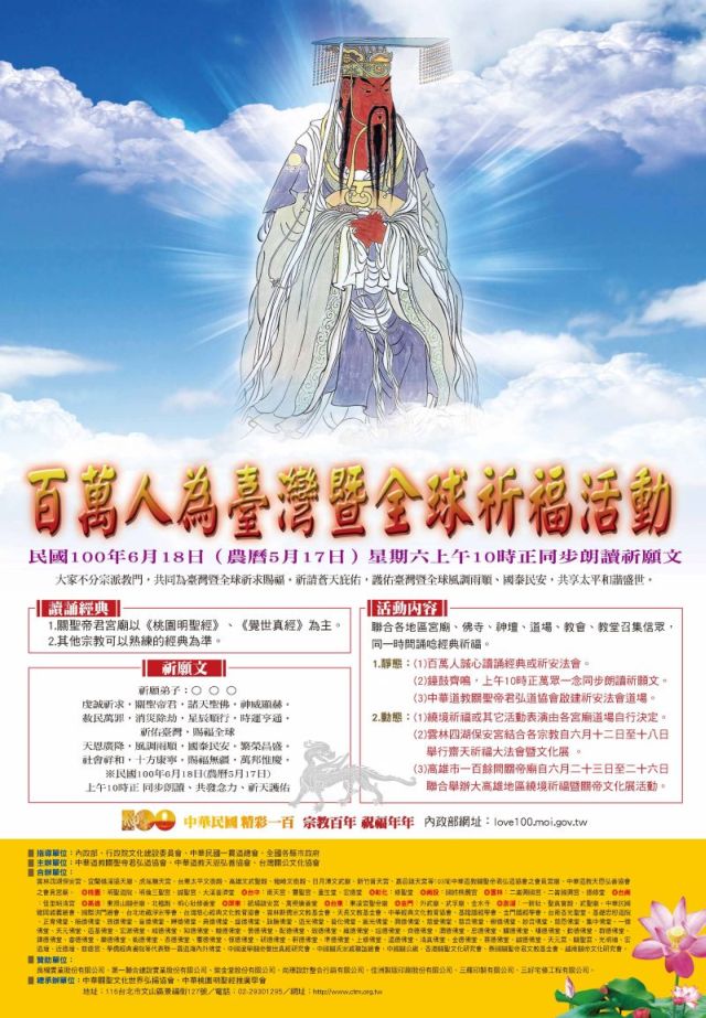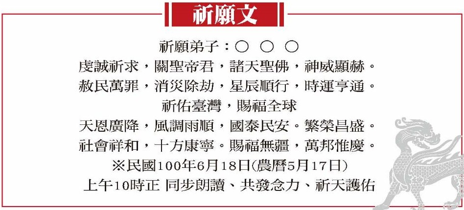民國100年6月18日(農曆5月17日)星期六上午10時正 同步朗讀祈願文