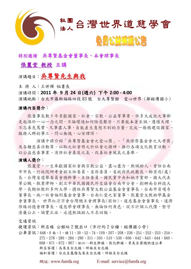 演講地點:台北市羅斯福路四段83號 台大尊賢館~愛心世界